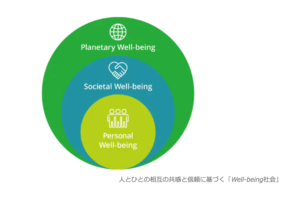 3つのレベルでのウェルビーイングを相乗的に高めて行くことが必要不可欠であり、全ての人々の主体的な関与を通じてその成果を実感し、共に分かち合うことができている社会であると述べています。