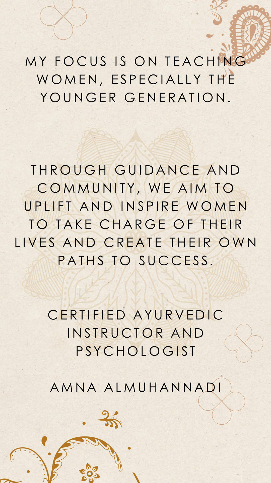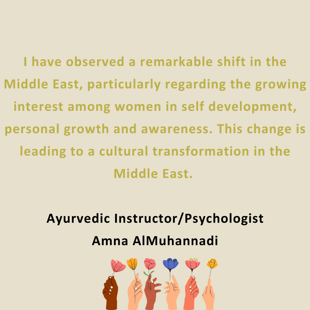 私の名前はアムナ・アルムハンナディです。カタール出身です。健康とウェルネスに興味があり、認定アーユルヴェーダ インストラクターであり、心理学者でもあります。